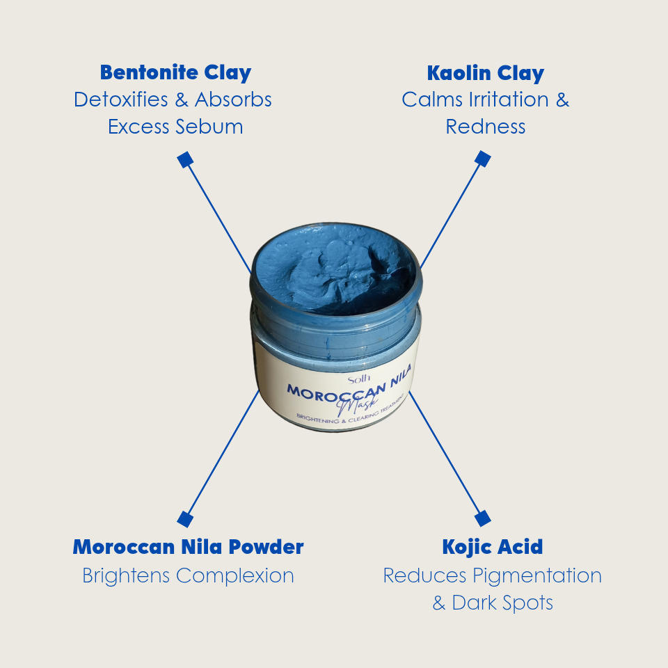 Our Moroccan Nila Mask is a luxurious blend of 100% authentic Nila powder, kaolin clay, Kojic Acid, Licorice Root Extract, Vitamin E, and an Herbal blend of skin-soothing botanicals that include Sandalwood Powder, Hibiscus Powder, Gramflour, to name a few — designed to purify and brighten your complexion.